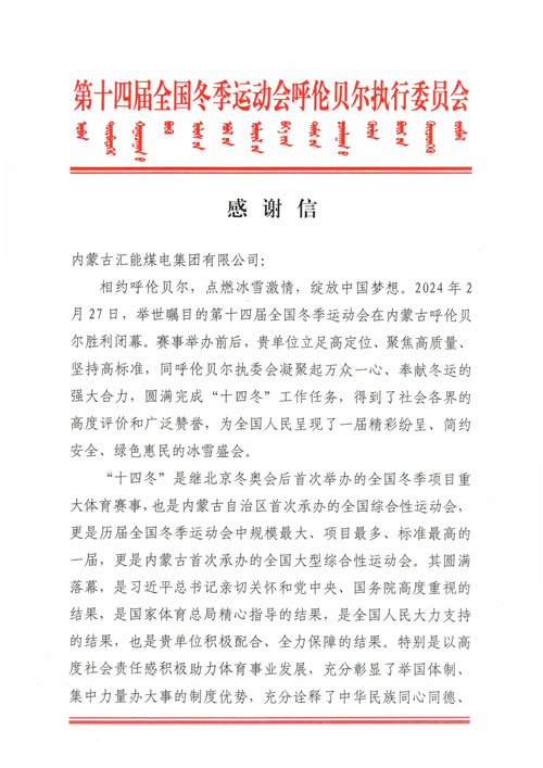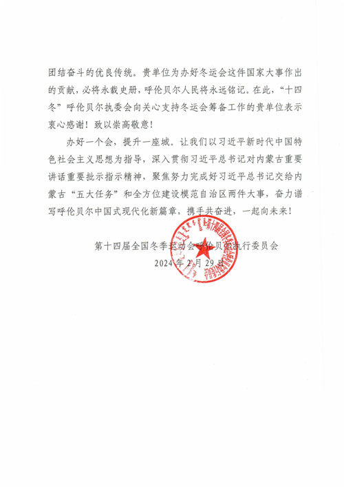 相約呼倫貝爾,點(diǎn)燃冰雪激情,綻放中國(guó)夢(mèng)想。2024年2 月27日,舉世矚目的第十四屆全國(guó)冬季運(yùn)動(dòng)會(huì)在內(nèi)蒙古呼倫貝 爾勝利閉幕。賽事舉辦前后,貴單位立足高定位、聚焦高質(zhì)量、 堅(jiān)持高標(biāo)準(zhǔn),同呼倫貝爾執(zhí)委會(huì)凝聚起萬(wàn)眾一心、奉獻(xiàn)冬運(yùn)的 強(qiáng)大合力,圓滿完成“十四冬”工作任務(wù),得到了社會(huì)各界的 高度評(píng)價(jià)和廣泛贊譽(yù),為全國(guó)人民呈現(xiàn)了一屆精彩紛呈、簡(jiǎn)約 安全、綠色惠民的冰雪盛會(huì)。